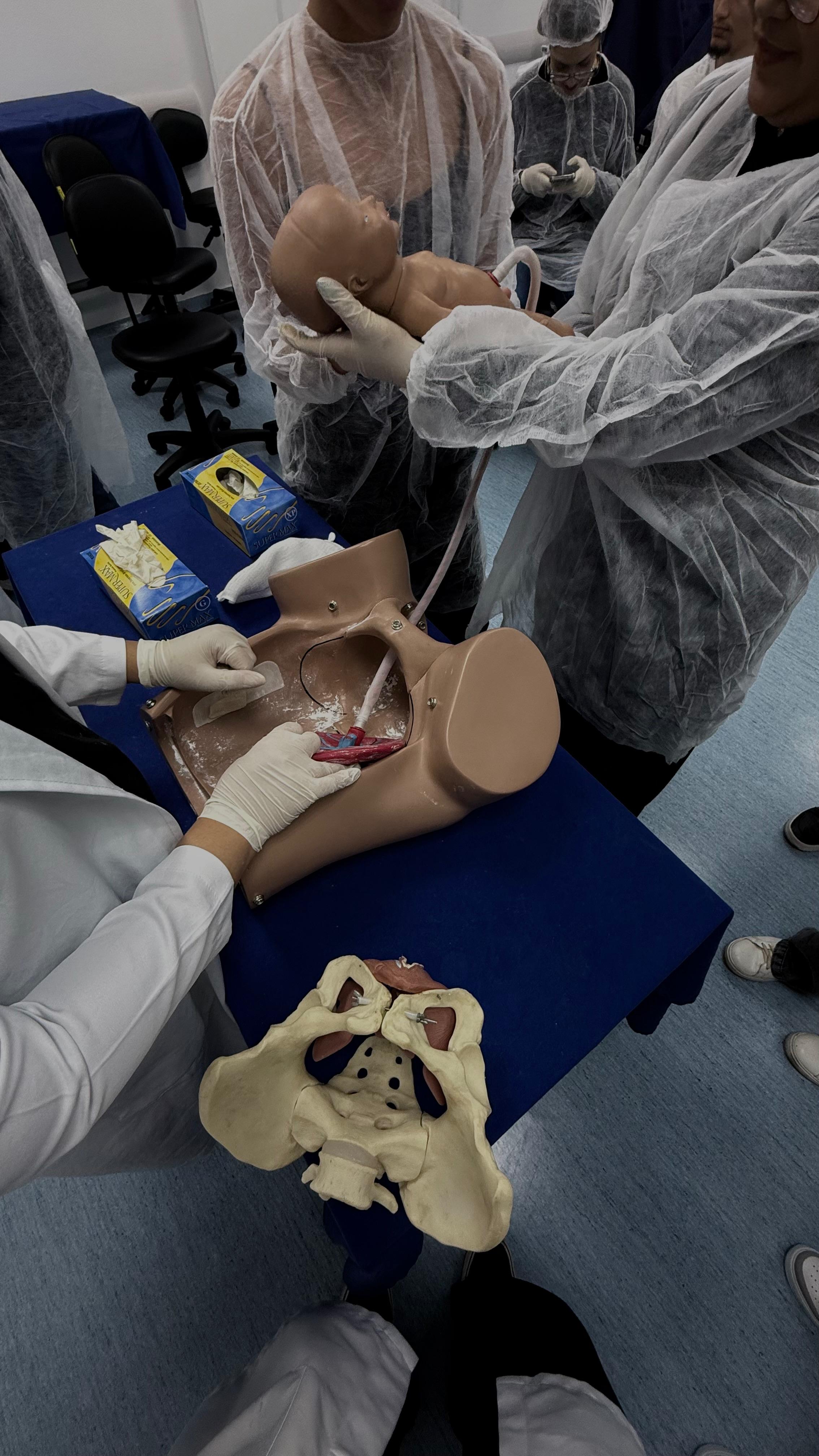Durante um dia inteiro, os participantes vivenciam oficinas práticas conduzidas pelas ligas acadêmicas — sutura, parto, genética, manejo de vias aéreas e muito mais. Uma experiência que transforma curiosidade em vocação.